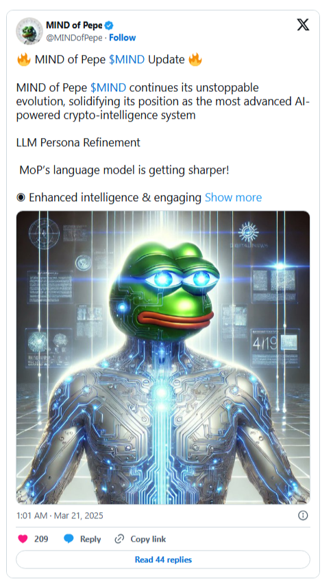 $ Mind — это знак, который функционирует как AI Cryptocurrency Agent — собирает данные, анализирует рыночные сигналы и предоставляет владельцы Автоматизированные инвестиционные рекомендацииПолем Благодаря технологии поиска-аугированного поколения (RAG) Mind of Pepe: