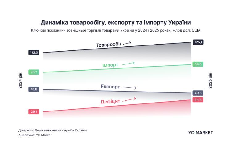 В результате торговый дефицит расширился до $44,4 млрд. Это главный итог периода: внешняя торговля Украины увеличилась по объему, но стала еще импортозависимее.