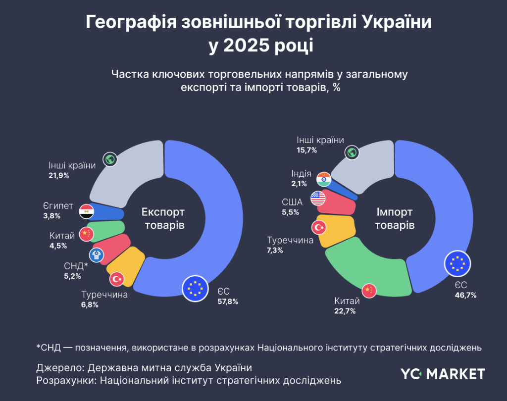 География торговли в 2025 году показывает окончательное закрепление ЕС как главного внешнеторгового направления Украины – на страны ЕС приходилось 57,8% украинского экспорта и 46,7% импорта.