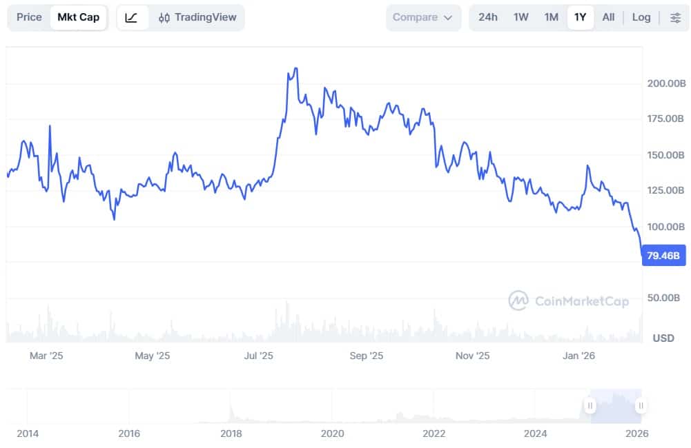 Одной из главных причин такого положения дел, несомненно, является массовый отток капитала. С момента своего пика в июле 2025 года общая капитализация Ripple снизилась примерно на 153%. На тот момент проект собрал чуть более 210 миллиардов долларов США. Он потерял 130 миллиардов долларов с рекордных максимумов и теперь имеет около 80 миллиардов долларов. Всего в начале недели проект потерял примерно $20 млрд за один день.