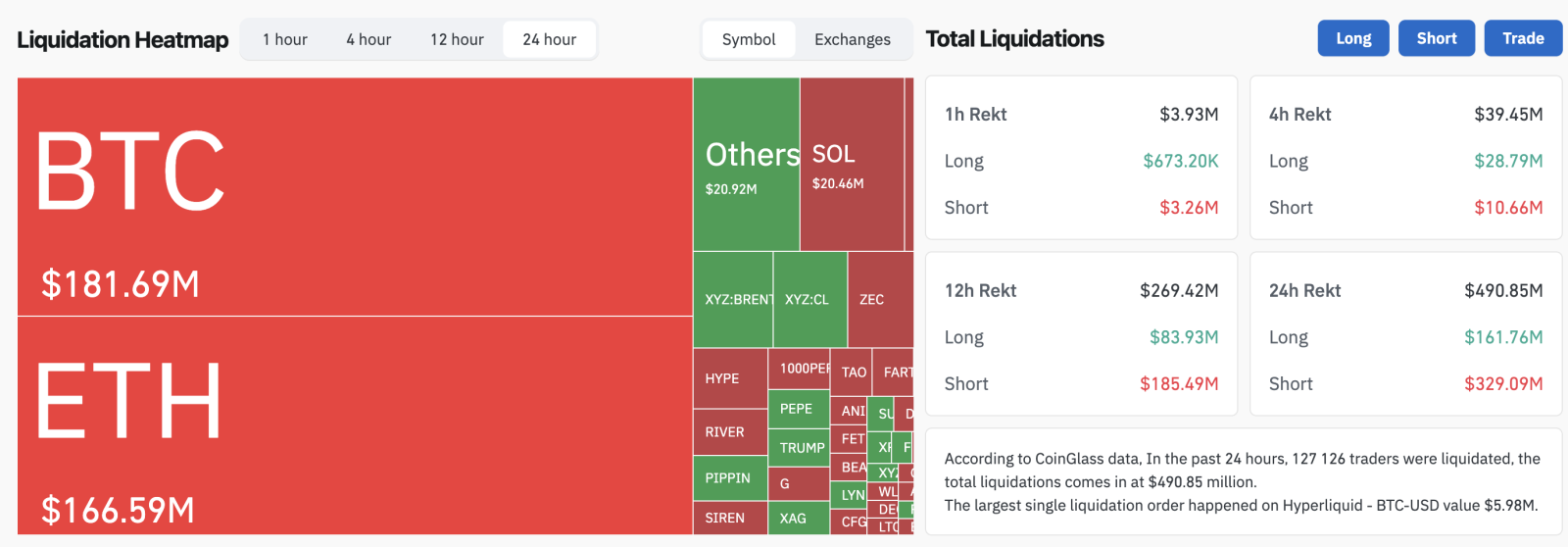 В разрезе активов больше всего потерь пришлось на лидеров рынка. Ликвидации по биткоину составили $181,69 млн, а за Ethereum — $166,59 млн.