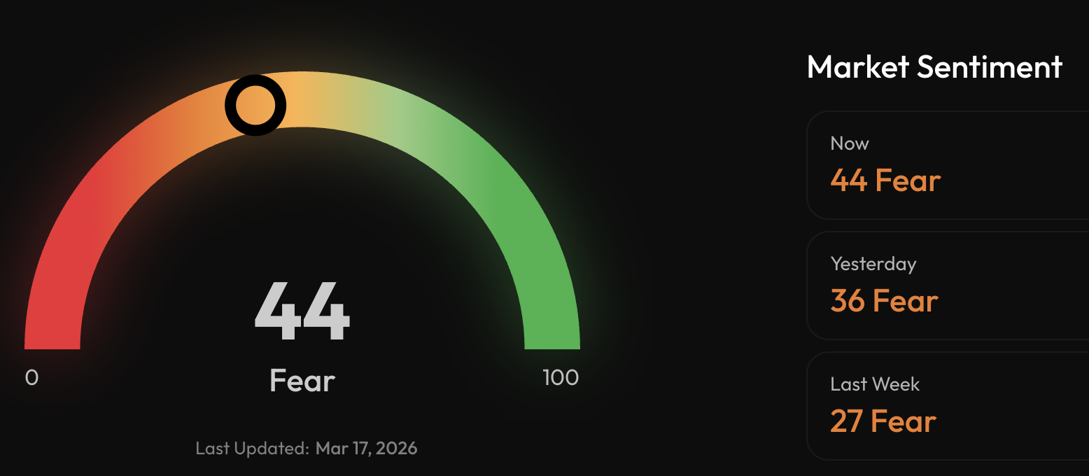 Интересно, что, несмотря на уверенный рост курса, общий настрой инвесторов остается осторожным. Индекс страха и алчности находится на уровне 44 пунктов, что соответствует зоне страха.