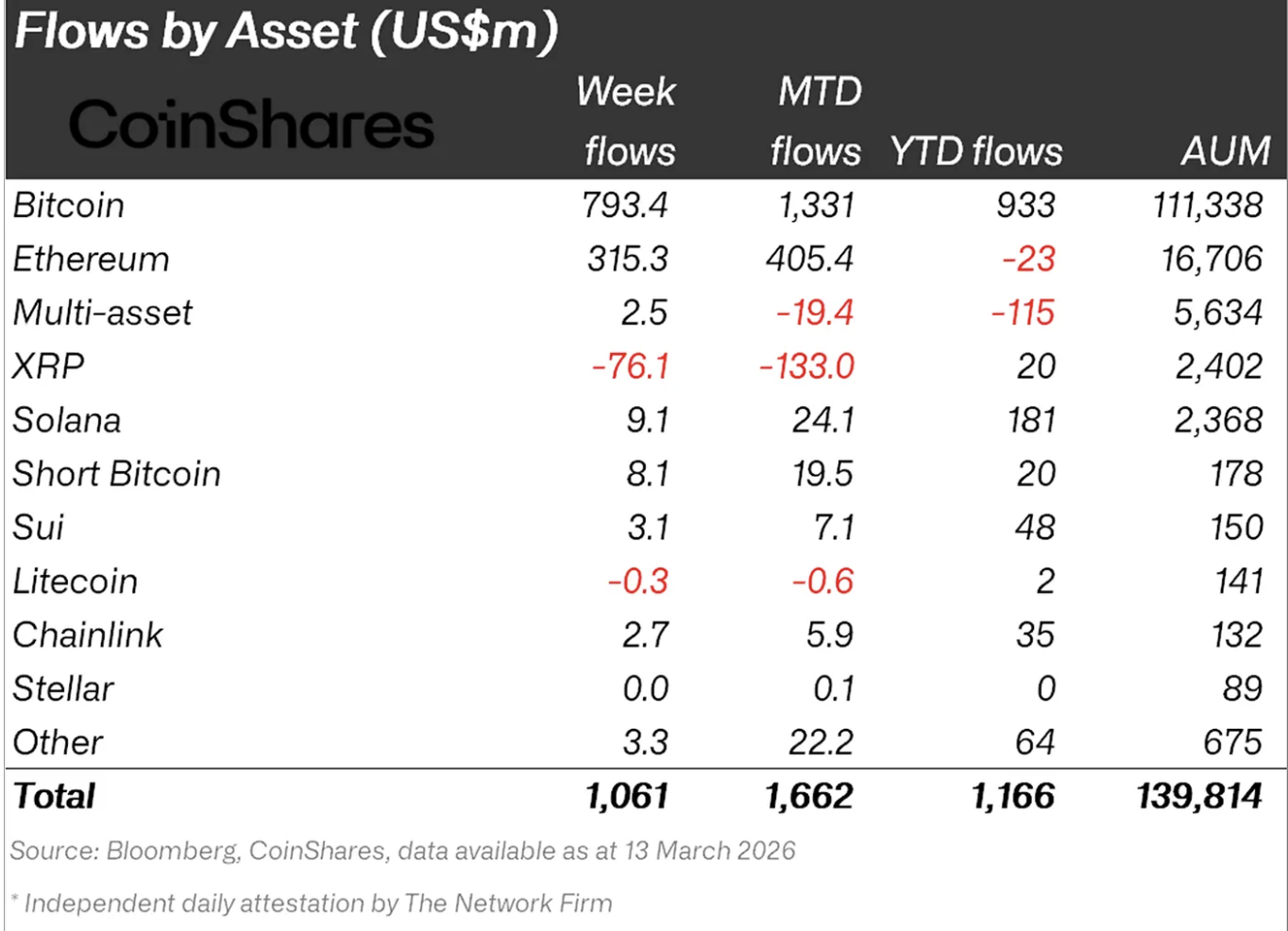 Криптовалютные инвестиционные продукты показывают устойчивую положительную динамику. По данным аналитиков CoinShares, в течение недели с 9 по 13 марта приток капитала в сектор составил $1,06 млрд. Это уже третья подряд неделя активного роста интереса со стороны крупных игроков.