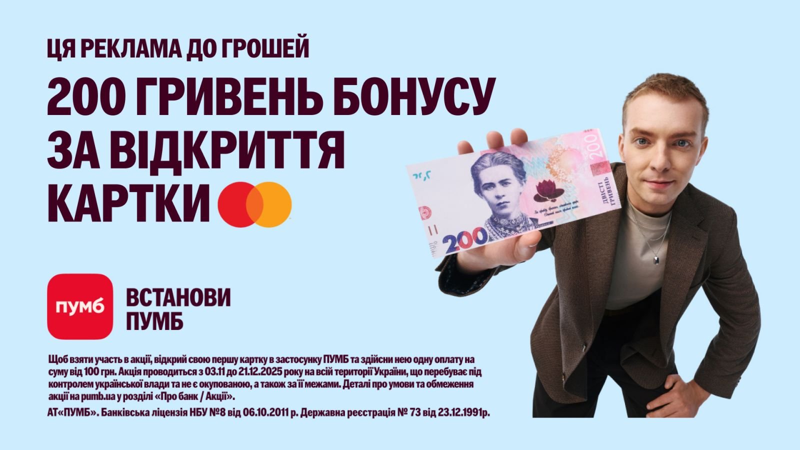 С 3 ноября по 21 декабря 2025 года новые клиенты, открывшие карту «ВСЕМОЖУ Онлайн» от Mastercard в приложении ПУМБ, сделают один платеж на сумму 100 гривен и получат гарантированный бонус 200 гривен на виртуальный счет.