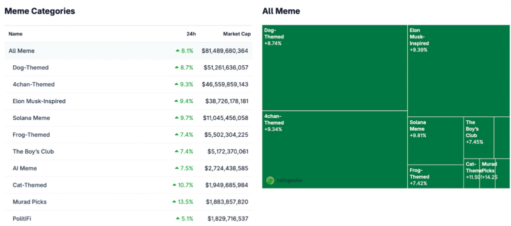 Общая капитализация этого сегмента достигла 81 миллиард долларов, растущий на 8% в течение 24 часовПолем Объем оборота достиг 8,8 млрд. Долл. США, что показывает, что процентные доходности с большой силой. Dogecoin набрал 9,5%, Shiba Inu 6,1%и Pepe 7,1%. Самым большим сюрпризом был токен SPX6900 (SPX), который после предыдущей потери, отраженного на целых 17,6%.