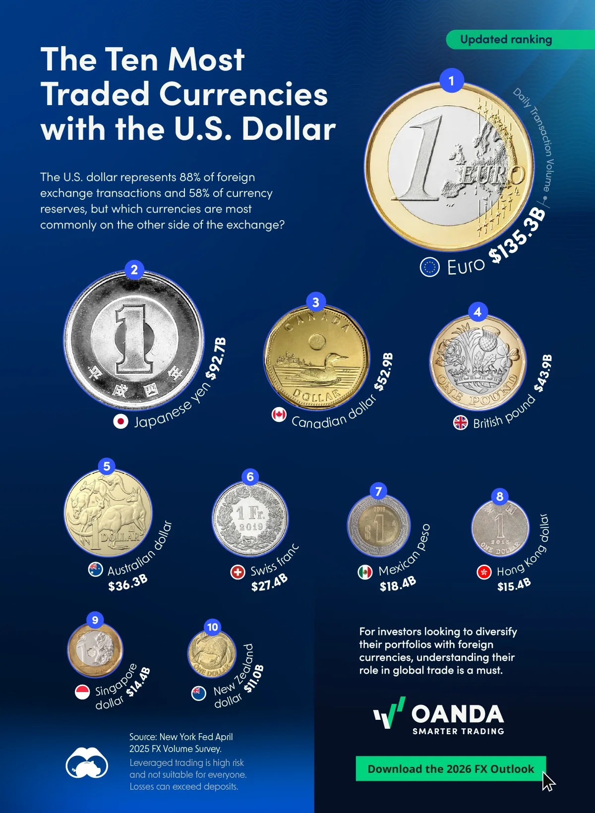 Доллар США продолжает удерживать статус безоговорочного лидера мировой финансовой системы, участвуя в 88% всех валютных операций на планете. Наибольший объем торгов против доллара приходится на евро, что подтверждает тесную экономическую связь США и еврозоны. Об этом свидетельствуют данные совместного исследования OANDA и Visual Capitalist.