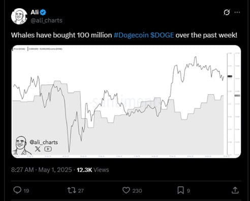 Тем не менее, кажется, что за последние недели возрождения на рынке крупные владельцы решили, что в их кошельках стоит увеличить интюссии Doge. Как сообщил Али Мартинес, в одной из последних записей на X Киты купили до 100 миллионов догекоин на прошлой неделе.