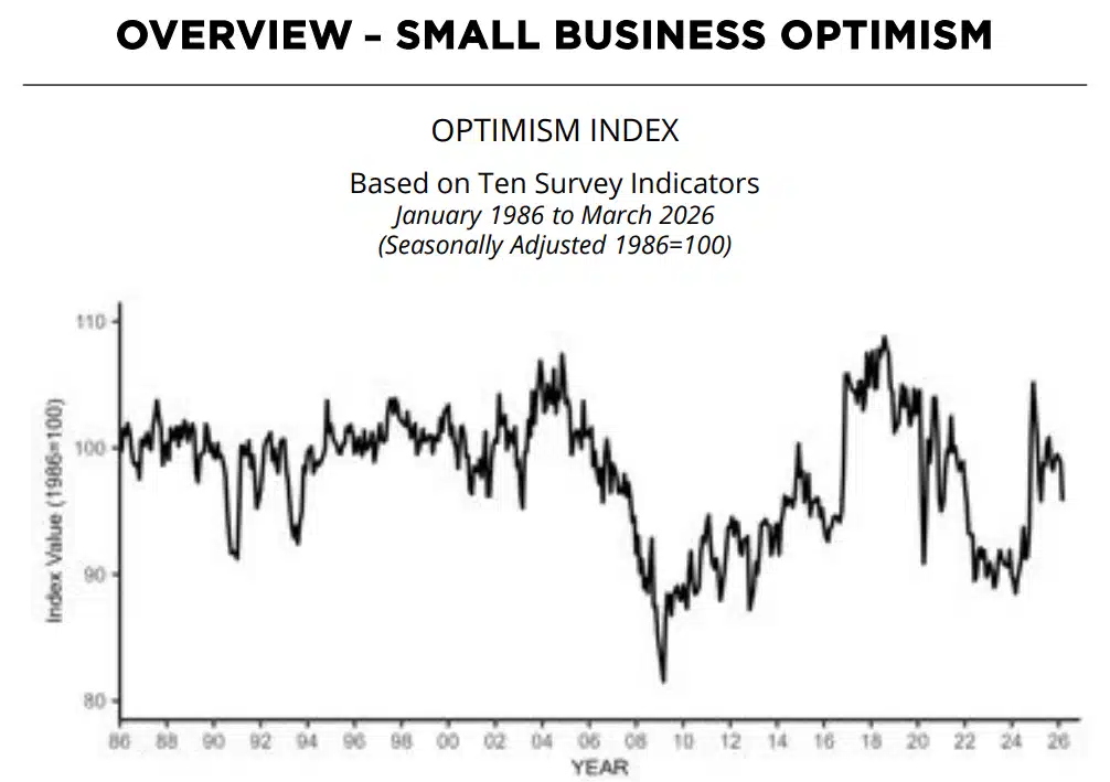 Маршировать данные о настроениях среди малого бизнеса в США показывают явную трещину в прежней устойчивости сектора. Индекс оптимизма упал до 95,8 пункта, потеряв целых 3 пункта по сравнению с февралем и опустившись ниже своего среднего показателя за 52 года, равного 98. Это первый подобный момент с апреля прошлого года, что придает этому движению больший вес, чем обычное месячное колебание. До недавнего времени малый бизнес был одним из столпов экономической стабильности.