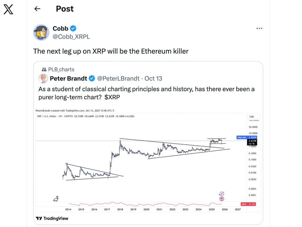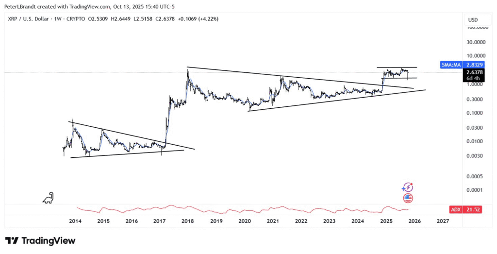 Диаграмма Брандта охватывает данные о ценах XRP за более чем десятилетие (2013–2025 гг.), показывая структуру симметричных треугольников и зон консолидации. По словам Брандта, график XRP является «учебным» примером рыночного ритма, обусловленного циклами накопления и распределения.