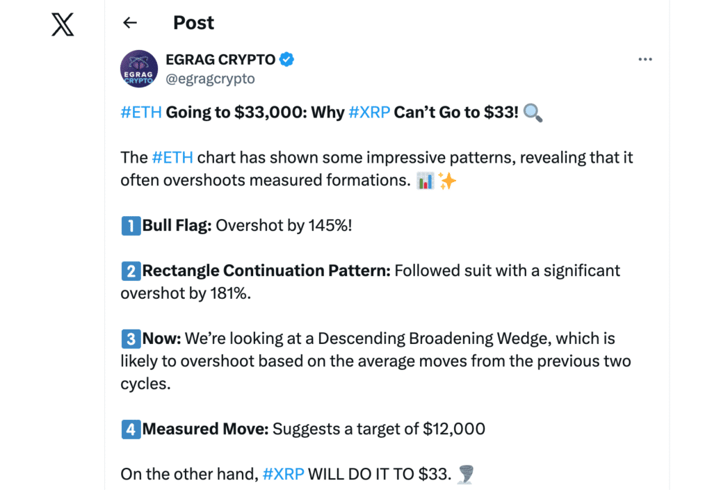 EGRAG считает, что если Ethereum достигнет $33 000, XRP может взлететь на 1000% — с $3 до $33. Он называет этот результат «написано в кодеобусловленный долгосрочными техническими формациями и повторяющимися рыночными моделями».
