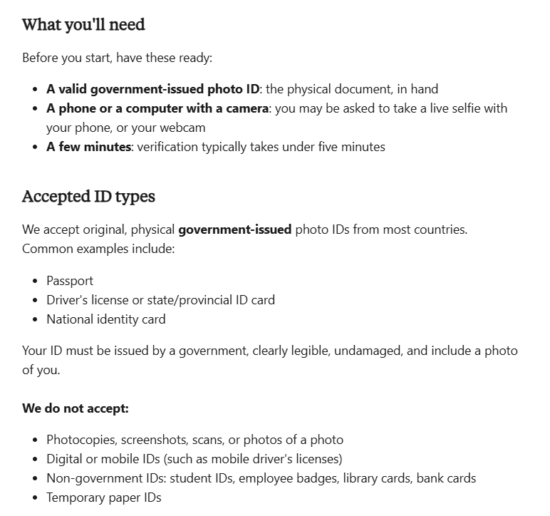 По случаю публикации Claude Opus 4.7 компания Anthropic также решила обновить свои правила. Внимание пользователей Интернета привлек один вопрос, который является совершенно новым при использовании моделей этой компании. Что ж, отныне новым пользователям Claude придется подтверждать себя с помощью официального документа, такого как удостоверение личности, водительские права или паспорт. Как мы можем прочитать на официальном сайте поддержки Claude, введение проверки новых учетных записей призвано предотвратить потенциальные злоупотребления. Еще одна причина, по мнению компании, — адаптация к требованиям законодательства некоторых стран. Так что можно сказать, что Anthropic идет по стопам Еврокомиссии. Вчера Урсула фон дер Ляйен объявила, что заявка ЕС на проверку возраста почти готова.