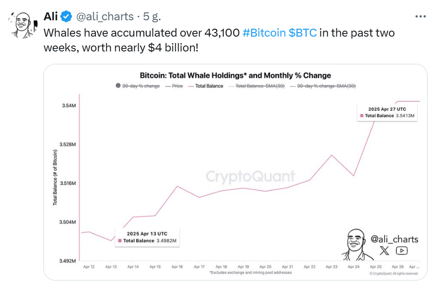 Тем временем киты не сидят со своими руками. По словам Али Мартинеса, только за последние две недели они выиграли более 43 000 BTC на сумму почти 4 миллиарда долларов. Случай? Маловероятно.