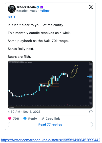 Некоторые аналитики – например Торговец Коала – однако они отмечают, что нынешние движения напоминают консолидация с 2023–2024 гг.что предшествовало сильному прорыву. Если история повторится, в декабре рынок может увидеть новый импульс роста с потенциальной целью около 135 000–145 000 долларов США.