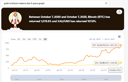 За последние пять лет Биткойн превзошел золото более чем на 1100%. В то время как золото выросло примерно на 107%, Биткойн взлетел до небес. Из непостоянного любопытства он превратился в уважаемого средство сбережения.