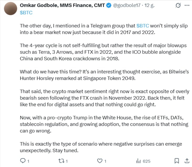 Между тем, рынок криптовалют остается полем столкновения крайне разных мнений. Хотя технический анализ Годболеа указывает на цель в 100 000 долларов США при поддержке 200-дневной простой скользящей средней на уровне 107 000 долларов США, некоторые эксперты смотрят в будущее с непоколебимым оптимизмом. Например, известный биткойн-энтузиаст Энтони Помплиано считает, что криптовалюта не перестанет расти, пока центральные банки продолжают печатать деньги, рассматривая BTC как инструмент защиты богатства в мире дешевых денег. Другой аналитик, apsk32, в своем сообщении на X (ранее Twitter) отметил, что BTC «продолжает на удивление точно повторять предыдущие циклы», и, если эта тенденция сохранится, мы можем увидеть пик около 200 000 долларов в ноябре или декабре 2025 года, несмотря на экономические проблемы.