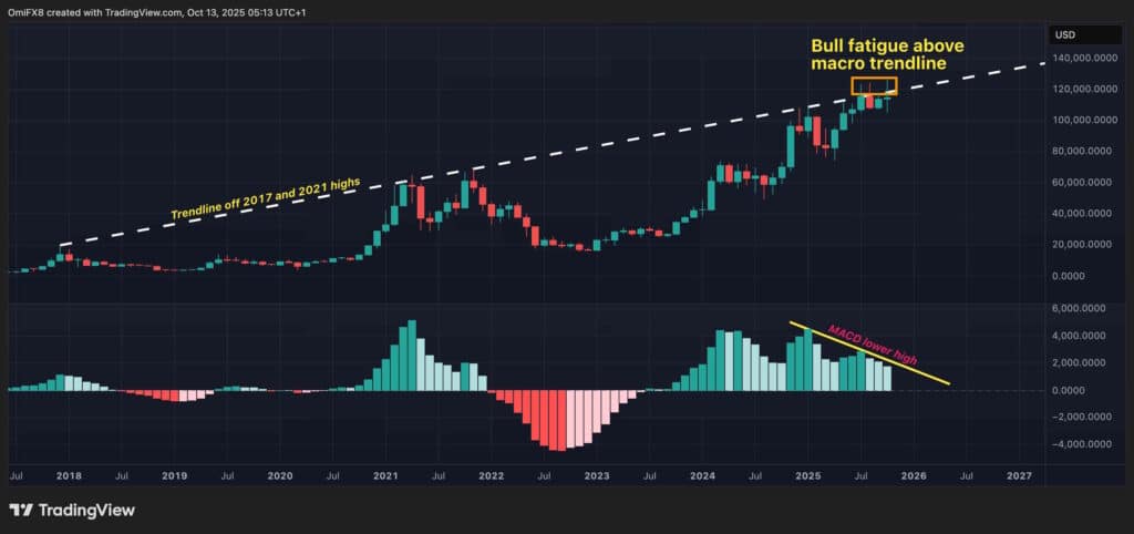 Месячные и дневные графики Биткойна подтверждают медвежьи настроения, подчеркивая усталость покупателей. Длинные фитили на июльских, августовских и октябрьских свечах указывают на трудности с поддержанием более высоких уровней цен над линией тренда.