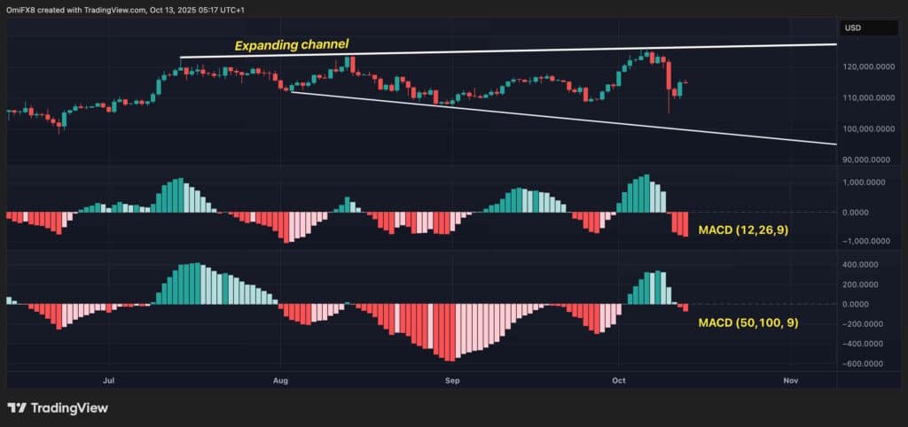 Более того, хотя гистограмма MACD (Moving Average Convergence Divergence) остается положительной на месячном графике, ее значение ниже, чем во время ралли в декабре и январе, когда BTC впервые пересек отметку в 100 000 долларов. Это ослабление восходящего импульса в сочетании с резким разворотом от сопротивления расширяющегося канала, видимого на дневном графике, представляет собой сильный медвежий сигнал.