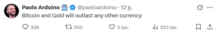 Паоло Ардоино, генеральный директор Tether, еще раз выразил свою твердую уверенность в том, что Биткойн и золото — это активы, которые переживут любую другую валюту.