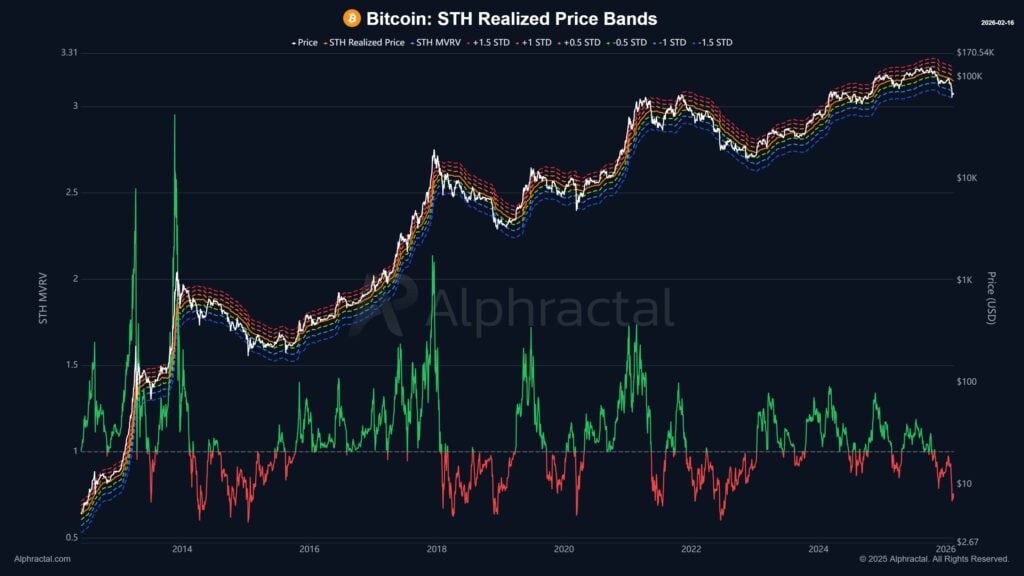 Биткойн в настоящее время остается в ловушке узкого коридора между поддержкой и сопротивлением, которые определяются ценой реализации краткосрочных держателей. В последние недели курс криптовалюты строго соблюдал полосы стандартного отклонения на уровнях минус один и минус полтора, что показывает, насколько важной стала эта зона для дальнейшей судьбы бычьего рынка. Исторически любое движение ниже нижней синей полосы приводило к одному из двух сценариев: либо к быстрому формированию дна, либо к болезненной фазе капитуляции, за которой следовала длительная аккумуляция. Эксперты рынка указывают на 200-недельную модель квантильной регрессии скользящего среднего, которая в настоящее время предполагает крайнюю перепроданность.