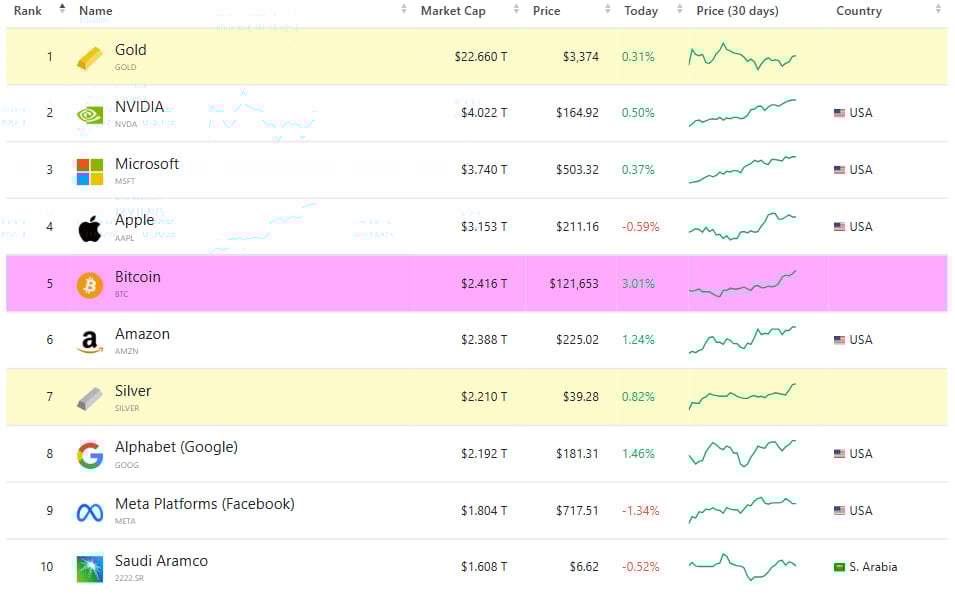 Как вы можете видеть в приведенном выше графике, с помощью капитализации, первая криптовалюта обошла такие компании, как Meta, Google, Saudi Aramco, Tesla, Berkshire Hothaway и другие. Кроме того, Биткойн снова впереди серебра за счет капитализации — эта ситуация произошла ранее.