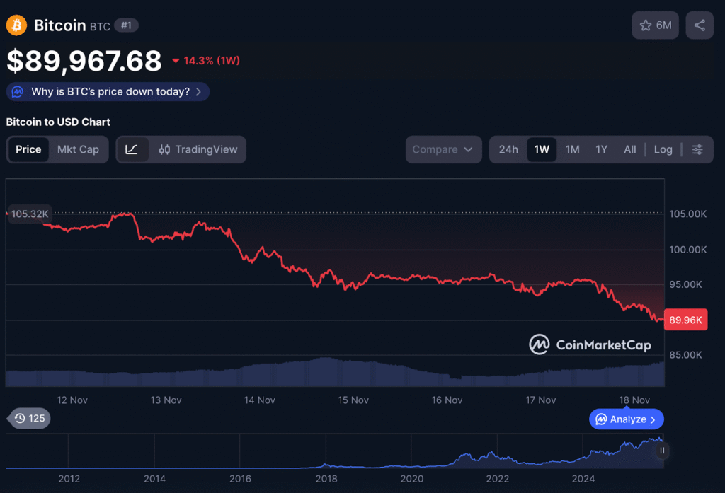 Биткойн в настоящее время торгуется на уровне около $89 960. За одну неделю он упал на 14% и в настоящее время на 29% ниже своего исторического максимума в 126 200 долларов. В то время как Биткойн теряет в цене, один новый альткойн полностью игнорирует этот спад.