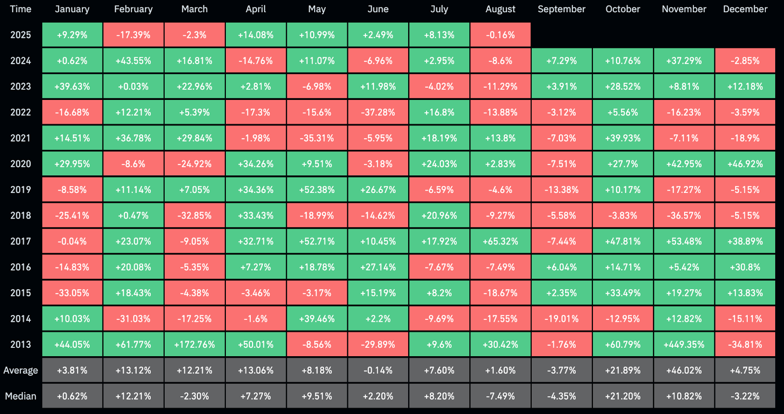 Статистика подтверждает, что сентябрь — сложный период. С 2013 года Биткойн закончился потерей восьми из двенадцати сентября, а средний результат этого месяца составляет 3,77%. В сезонном выражении только июнь хуже, но там средняя потеря составляет всего 0,14%.