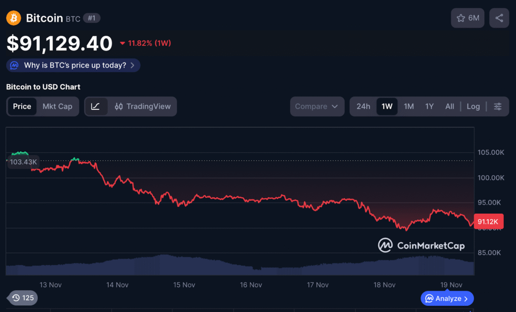 На момент написания цена Биткойна составляет примерно 91 129 долларов США. Это более или менее на 28% ниже цены 6 октября. На тот момент его рекорд превысил $126 000. Тем не менее, Том Ли ожидает, что Биткойн сильно восстановится и потенциально достигнет новых максимумов к концу года, чему способствует восстановление фондового рынка.
