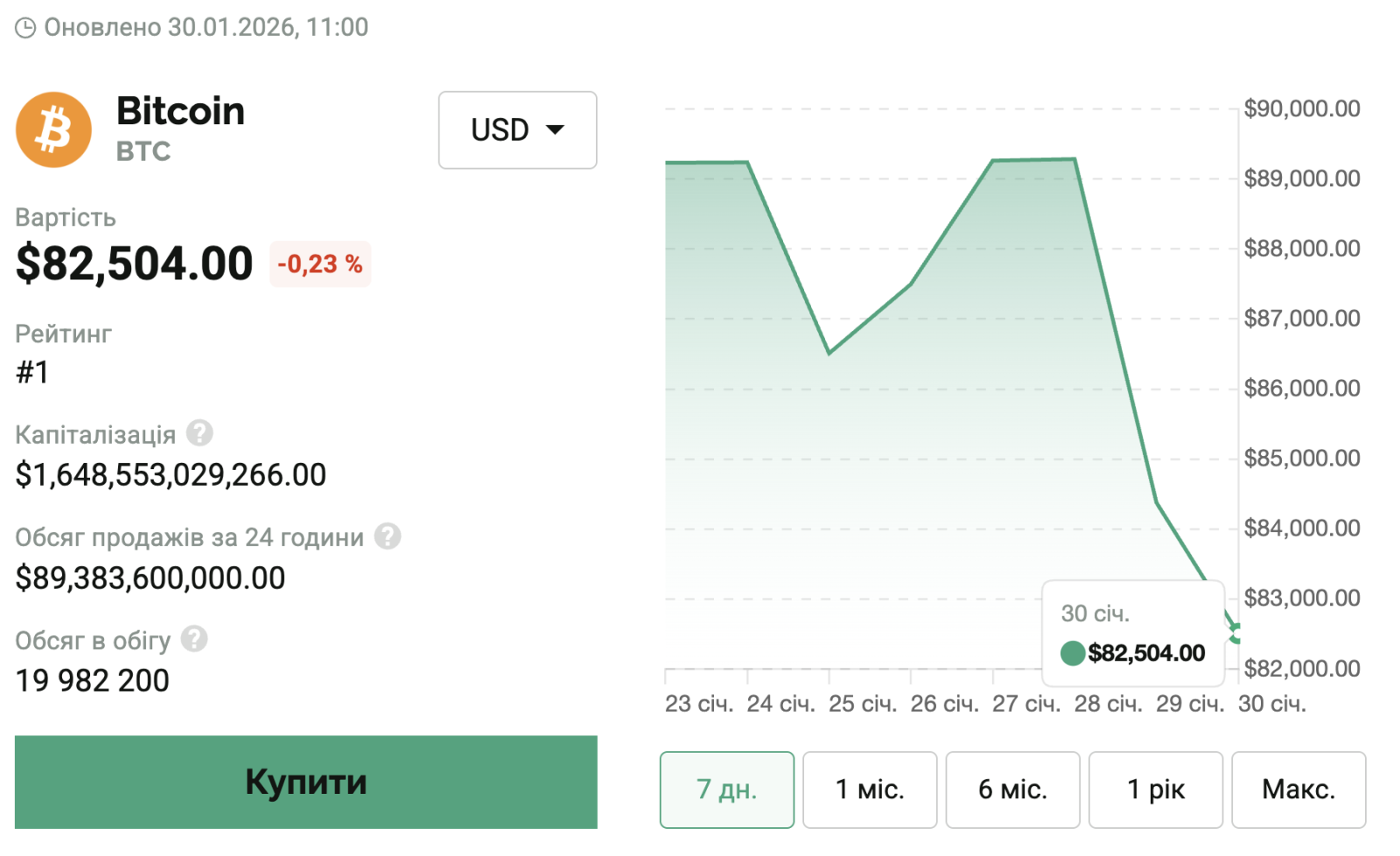 Несмотря на то, что вчера вечером первая криптовалюта упала ниже $85 000, крах Биткойна на этом не закончился. В ночь на 30 января актив торговался около $81 000. На момент написания цена BTC составляет около $82 500. За день «цифровое золото» потеряло более 6%.