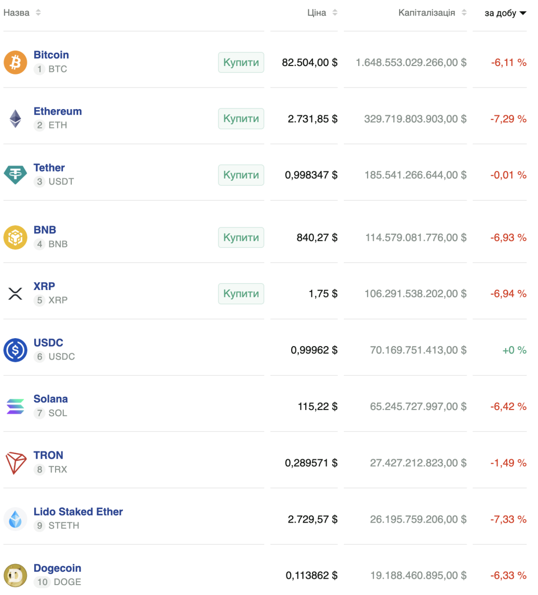 Ethereum также потерял позиции и упал ниже $2700. В настоящее время он торгуется около $2730. За последние 24 часа актив упал более чем на 7%. Остальные активы с наибольшей капитализацией также продемонстрировали снижение.