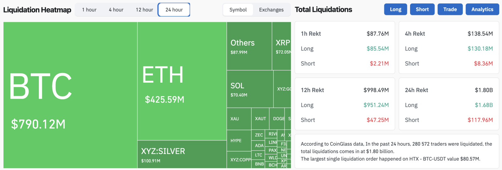 Это привело к массовым ликвидациям фьючерсных контрактов — ежедневные убытки достигли $1,8 млрд. Более 280 000 трейдеров были вынуждены закрыть позиции. Об этом свидетельствуют данные CoinGlass.