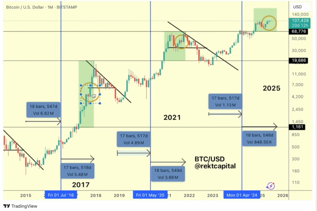 Это последний этап биткойн? Когда к 2026 году многие инвесторы объявляют о новом золотом цикле, один из самых узнаваемых аналитиков в мире криптовалют охлаждает эмоции. Rekt Capital, известный своим подходом, основанным на анализе циклов вдвое, предупреждает: Время закончилось, и рынок может достичь пика этой осенью. «У нас есть только узкое время для повышения цен (…), если история повторится, пик состоится в октябре». — говорит Rekt Capital. Почему?