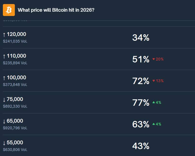 С момента рекорда 6 октября 2025 года криптовалюта уже потеряла более 34% от стоимости. Длинные ценные позиции были ликвидированы за последние 24 часа. более 1,5 млрд долларов США на всех токенах, по данным CoinGlass. Polymarket в настоящее время видит большую вероятность падения BTC до 55 000. долларов США, чем увеличение до рекордных 125 тысяч. долларов США к концу этого года.