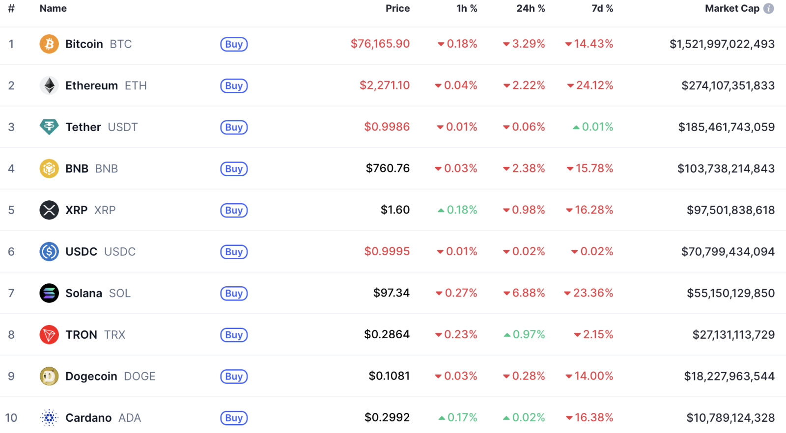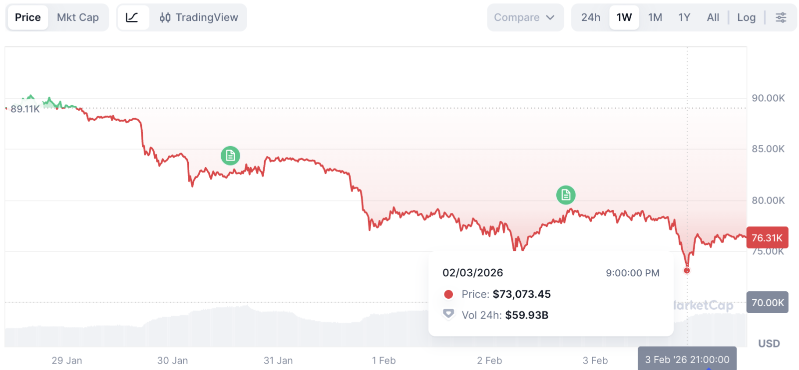 Вчера вечером, 3 февраля, биткойн на мгновение упал до $73 073, уровня начала ноября 2024 года, когда актив торговался на уровне $68 898. На момент написания цена первой криптовалюты составляет $76 165, по данным CoinMarketCap.