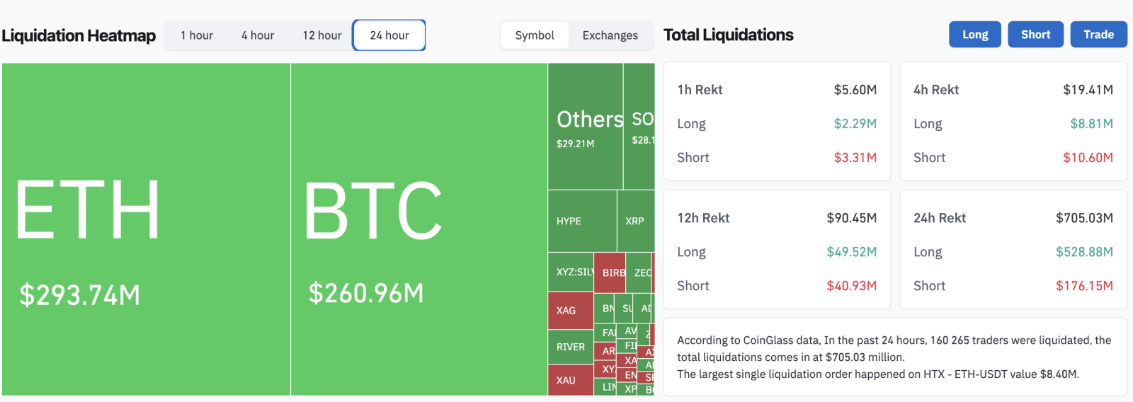 По данным CoinGlass, объем ликвидаций на фьючерсном рынке составил $705 млн в день. Более 160 000 трейдеров были вынуждены закрыть свои позиции.