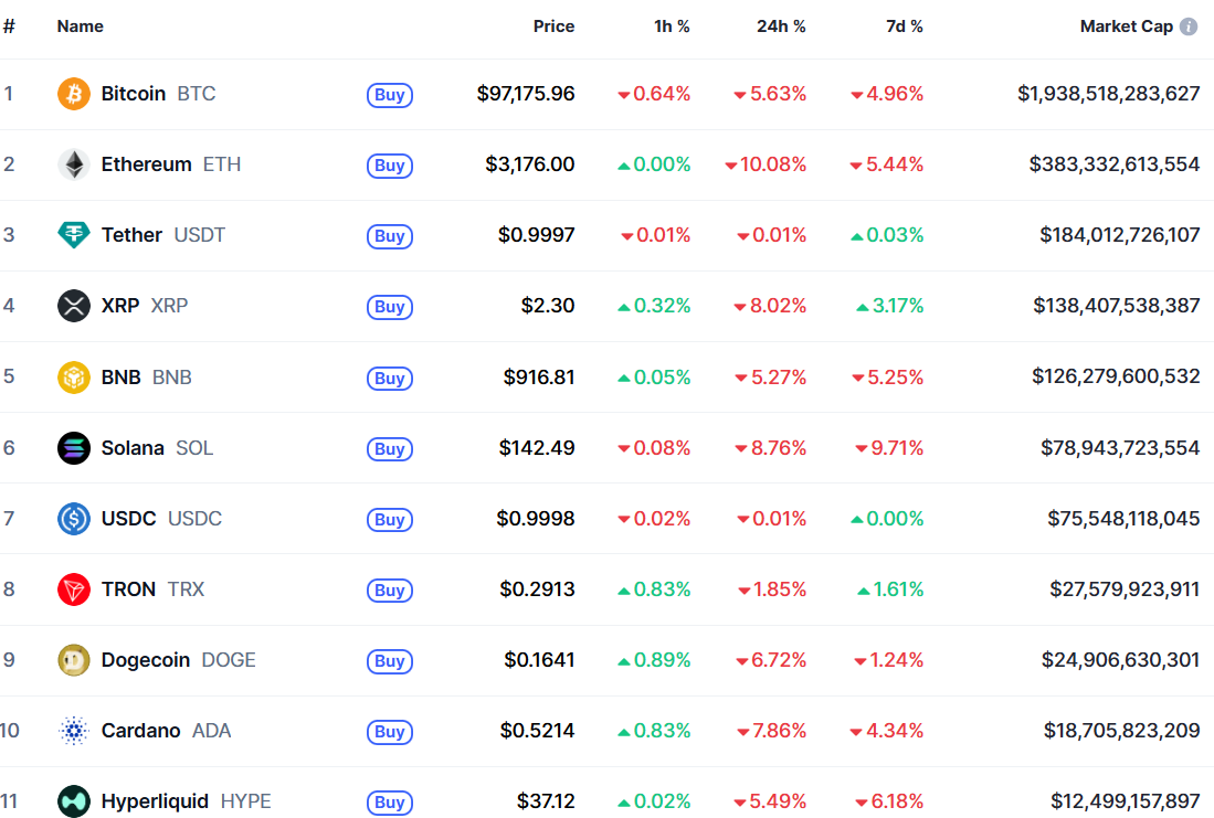 На момент написания Биткойн торгуется на уровне $97 175. За день монета потеряла 5,63%.