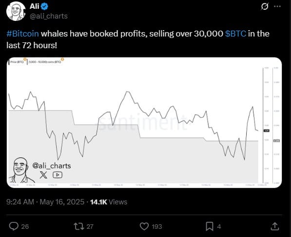 В этой загадке, которая создает оптимистичное видение ближайшего будущего, появился определенный элемент, который разрушает все. Это последние отчеты о китовой деятельности. Как сообщил Али Мартинес, в одном из последних постов на X за последние три дня киты продали более 30 000. BTC. Это вызывает некоторые проблемы, но что оправдано?