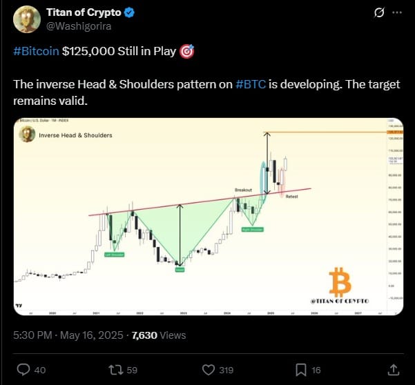 Титан критпо заметил еще одну формирование. Этот эксперт также рассмотрел текущие графики и заметил, что существует перевернутая голова и плечи (RG). Эта формация обычно означает обращение или продолжение текущей тенденции. Эксперт убежден, что в этом случае будет второй вариант, то есть продолжение увеличения. Вот почему Титан Крипто убежден, что цель для BTC в этом цикле, которую он писал ранее, все еще в игре. По словам аналитика Биткойн, он достигнет 125 000 в этом хосс. доллары.