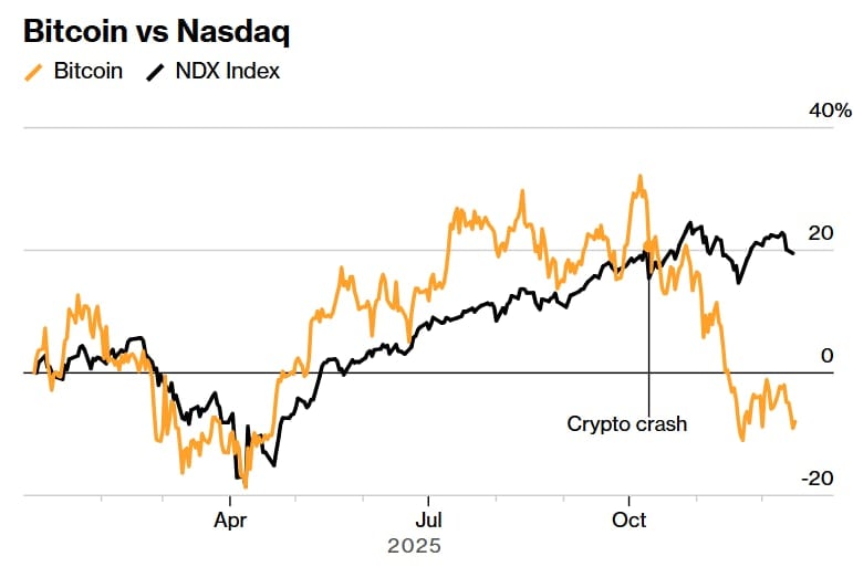 Одним из наиболее ярких сигналов является отклонение от фондового рынка. Пока В 2025 году индекс S&P 500 вырастет примерно на 16 пунктов.% и установил новые исторические максимумы, Биткойн движется в противоположном направлении. Nasdaq, с которым часто коррелируют криптовалюту, также показал значительно лучшие результаты.