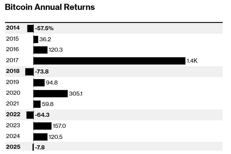 Биткойн движется к четвертой отрицательной норме доходности в своей истории, и впервые это происходит без сопутствующего скандала, краха фондового рынка или системного землетрясения. На сегодняшний день крупнейшая в мире криптовалюта находится примерно на 7–8% ниже отметки к 2025 году.. Цена BTC составляла около 87 000 долларов.