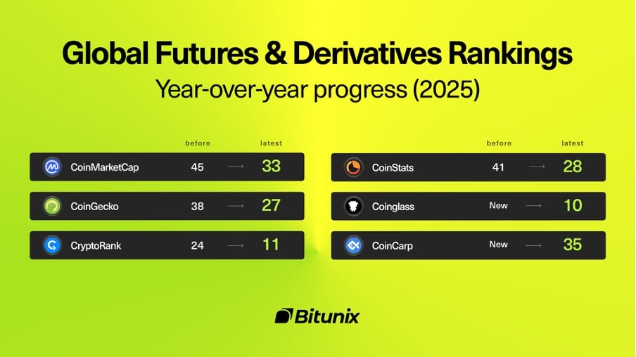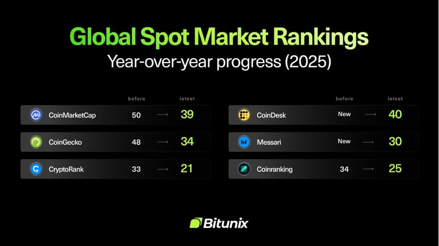 В совокупности эти факторы способствовали ежегодному росту Bitunix в глобальных рейтингах спотовых и деривативных инструментов.