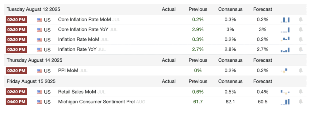 Самым важным моментом будет публикация Индикатор ИПЦ (Индекс потребительской цены) запланирован на вторник, 12 августа. Аналитики ожидают, что базовая инфляция увеличится с 2,9% в июне вниз 3,0% в июлеПолем