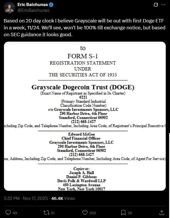 Bloomberg прогнозирует, что Grayscale очень близка к получению разрешения на выпуск DOGE ETF. Эрик Балчунас, аналитик ETF Bloomberg, подсчитал, что Grayscale может запустить свой продукт 24 ноября.. Оттенки серого были поданы 15 августа 2025 г. по форме S-1 для Dogecoin Trust. Если SEC одобрит продукт Grayscale, его аббревиатура будет GDOG.