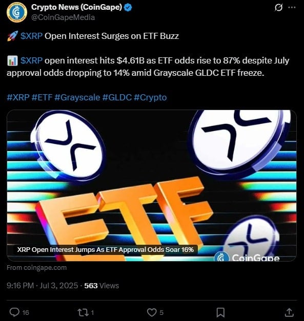 Прогнозы последних аналитиков дают надежду на такой сценарий. Несмотря на задержки с учетом XRP ETF от GreyScale, рынок остается оптимистичным в этом вопросе. Согласно Coingape на данный момент, Ripple имеет 87% вероятность одобрения этого продукта. В начале это было более 90%. Портал также указывает, что количество открытых контрактов на XRP увеличивается. Согласно Couminggass, открытый процент XRP увеличился на 2,98% до 4,61 млрд долларов. Объем увеличился на 8,26% до 7,73 миллиарда долларов США