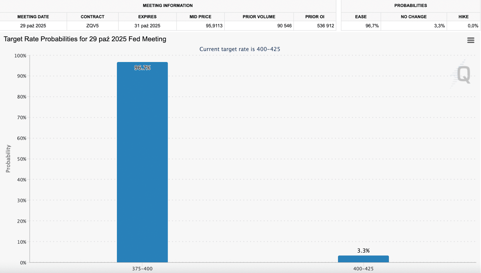По оценкам CME FedWatch, существует почти 97% вероятность того, что в конце октября произойдет снижение процентных ставок на 0,25 процентных пункта, до 3,75-4,00%.