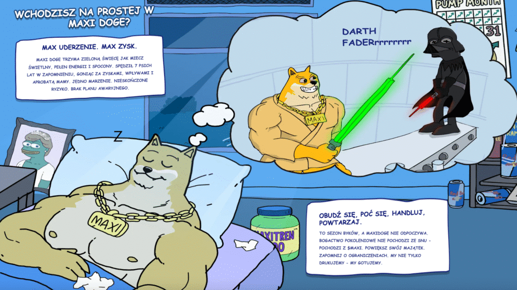 Макси Дож — мускулистый Бро, только что вышедший из спортзала и мечтающий свергнуть лидера мемкойнов. «Он держит зеленую свечу, как световой меч.веря в прибыль Х1000, но при этом не забывая о безопасности смарт-контрактов.