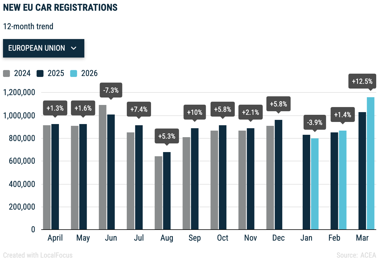Согласно графику регистраций, в марте 2026 года авторынок ЕС продемонстрировал впечатляющий рост – +12,5% по сравнению с аналогичным периодом прошлого года. В целом за первый квартал года количество новых регистраций увеличилось на 4%.
