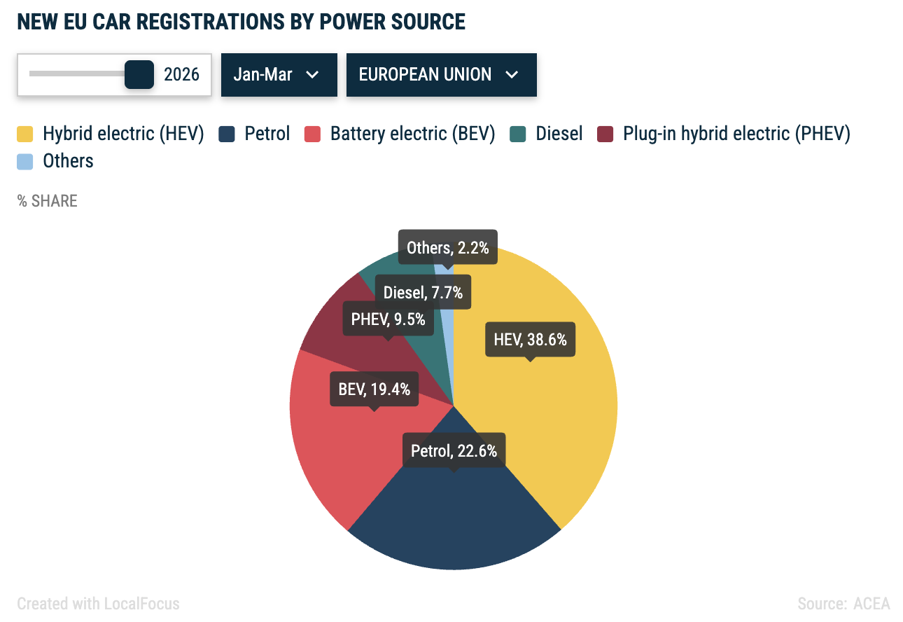 Данные за первый квартал 2026 свидетельствуют о росте регистраций новых гибридных авто в ЕС — до 1 089 421 единицы.