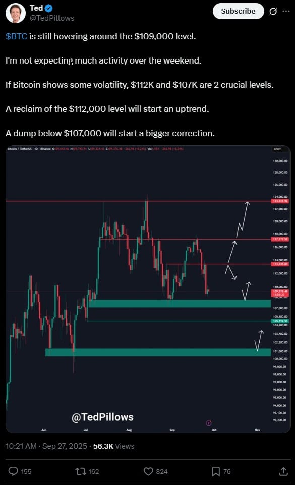 Хотя ситуация не подходит для быков, по крайней мере, она, кажется, стабилизируется. Однако даже это состояние еще далеко. Ted Pillows считает, что после снижения от уровня сопротивления выше 113 000 долларов США,