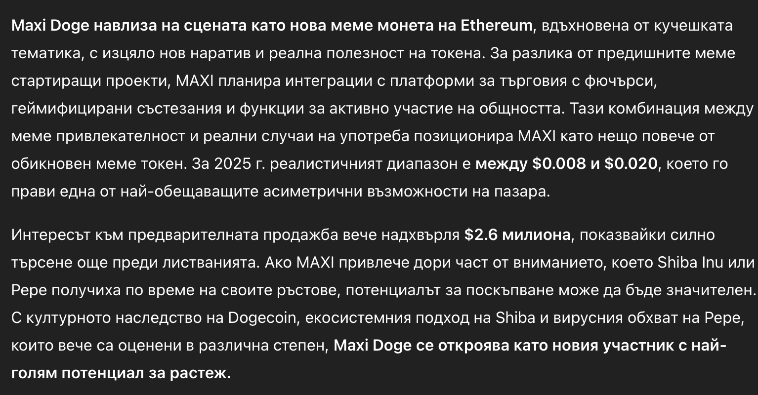 Второй выбор ИИ — Maxi Doge (MAXI), проект, который выделяется мускулистым талисманом и агрессивным визуальным стилем, напоминающим классический Dogecoin (DOGE), но с еще большей энергией.
