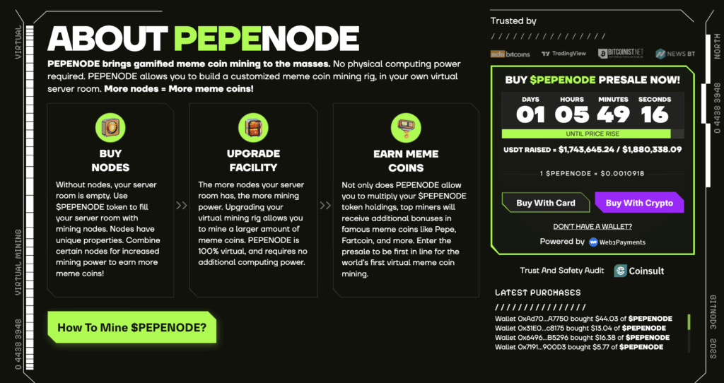PEPENODE, собранный на предварительной продаже более чем в 1,7 миллиона долларов, уже рассматривается как проект следующего поколения с потенциалом стать ведущим игроком в секторе мемкоинов.